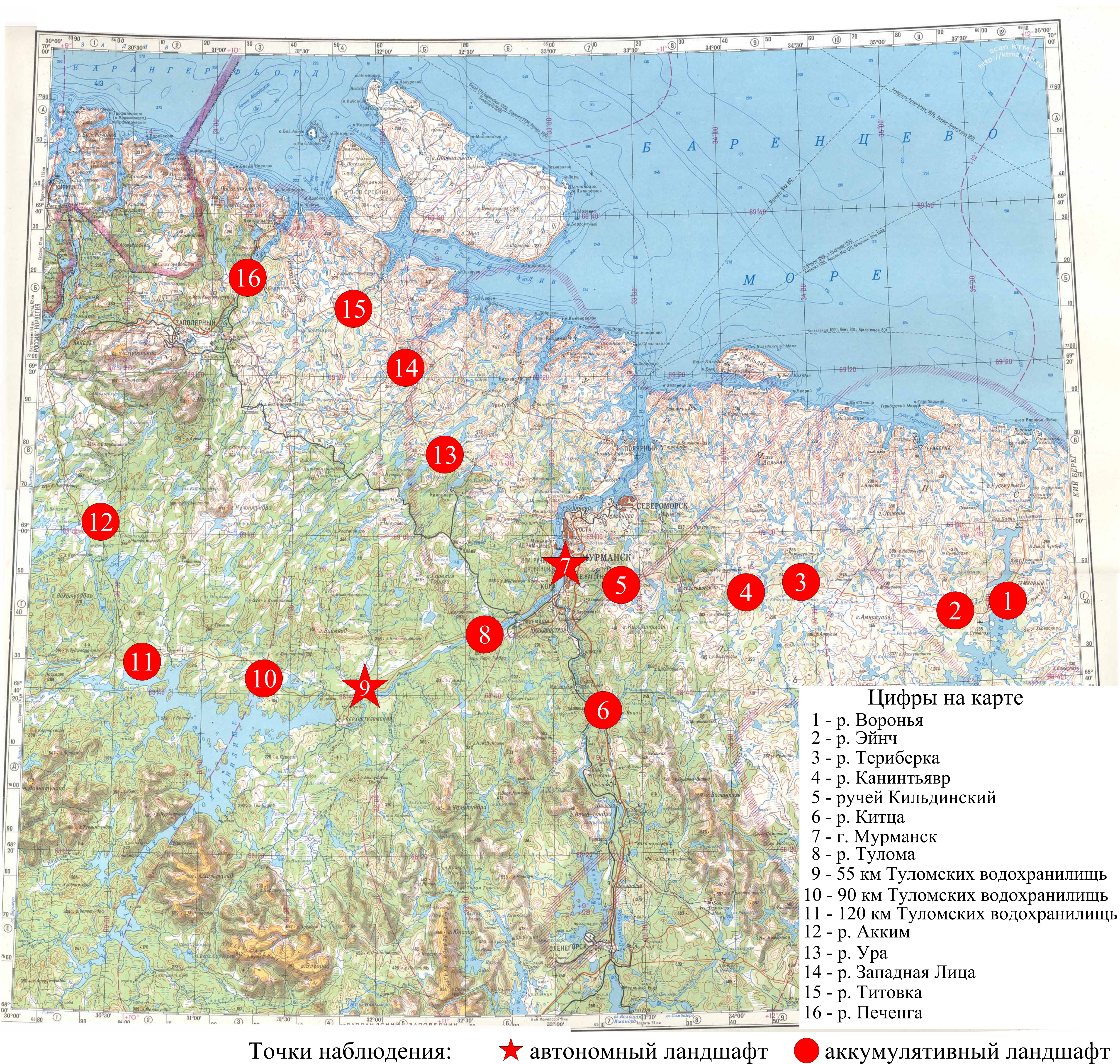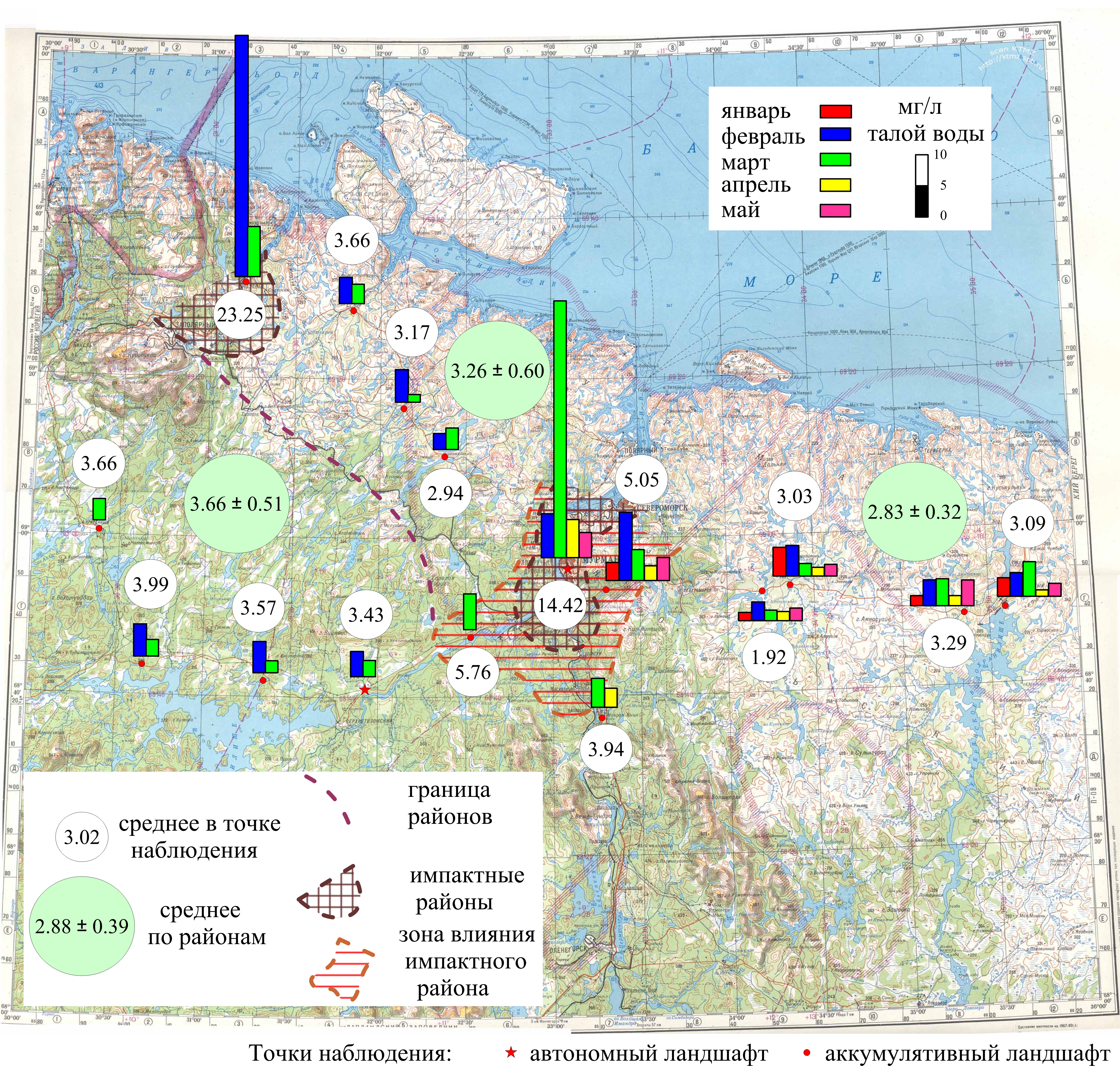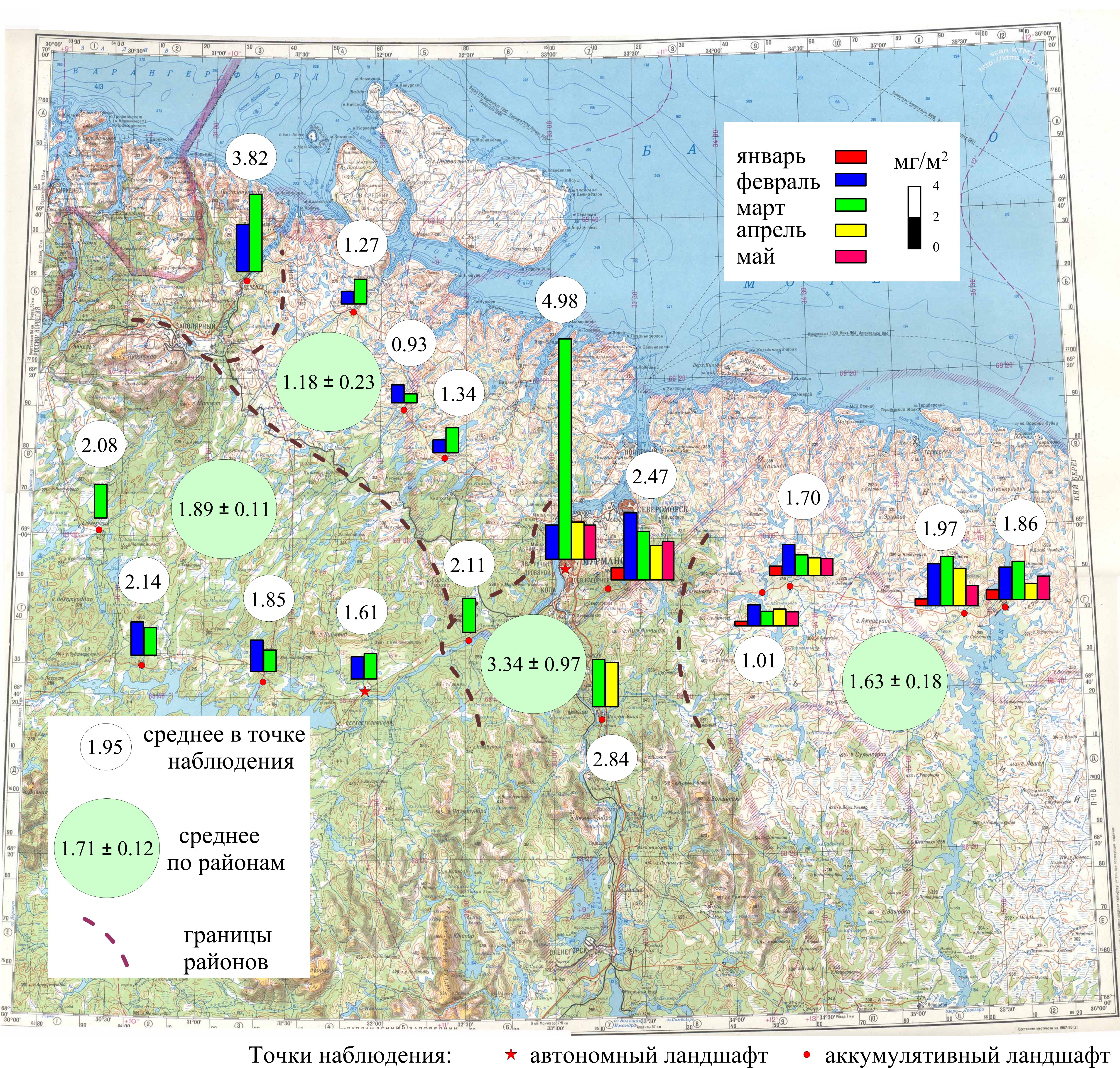 В результате исследований концентраций твердых аэрозольных частиц в свежевыпавшем снеге на севере Кольского полуострова было выявлено, что с января по май 2018 г. средняя концентрация твердых аэрозольных частиц составляла 4.04±0.24 мг/л (n=47), а средний поток аэрозольных частиц на поверхность земли 2.10±0.09 мг∙м2 за один снегопад. За зимний период 2018 г. (120 суток) на север Кольского полуострова поступило порядка 1.85-2.37 тыс. тонн аэрозольного осадочного вещества, из них 22-25 тонн Zn, 3.6-4.2 тонны Cu, 0.95-1.1 тонна Pb и 650-750 кг Cd. По результатам исследований предварительно выделено два импактных района на севере Кольского полуострова, а Мурманский берег разделен на три фоновых района, каждому из которых соответствует свой природно-ландшафтный комплекс.