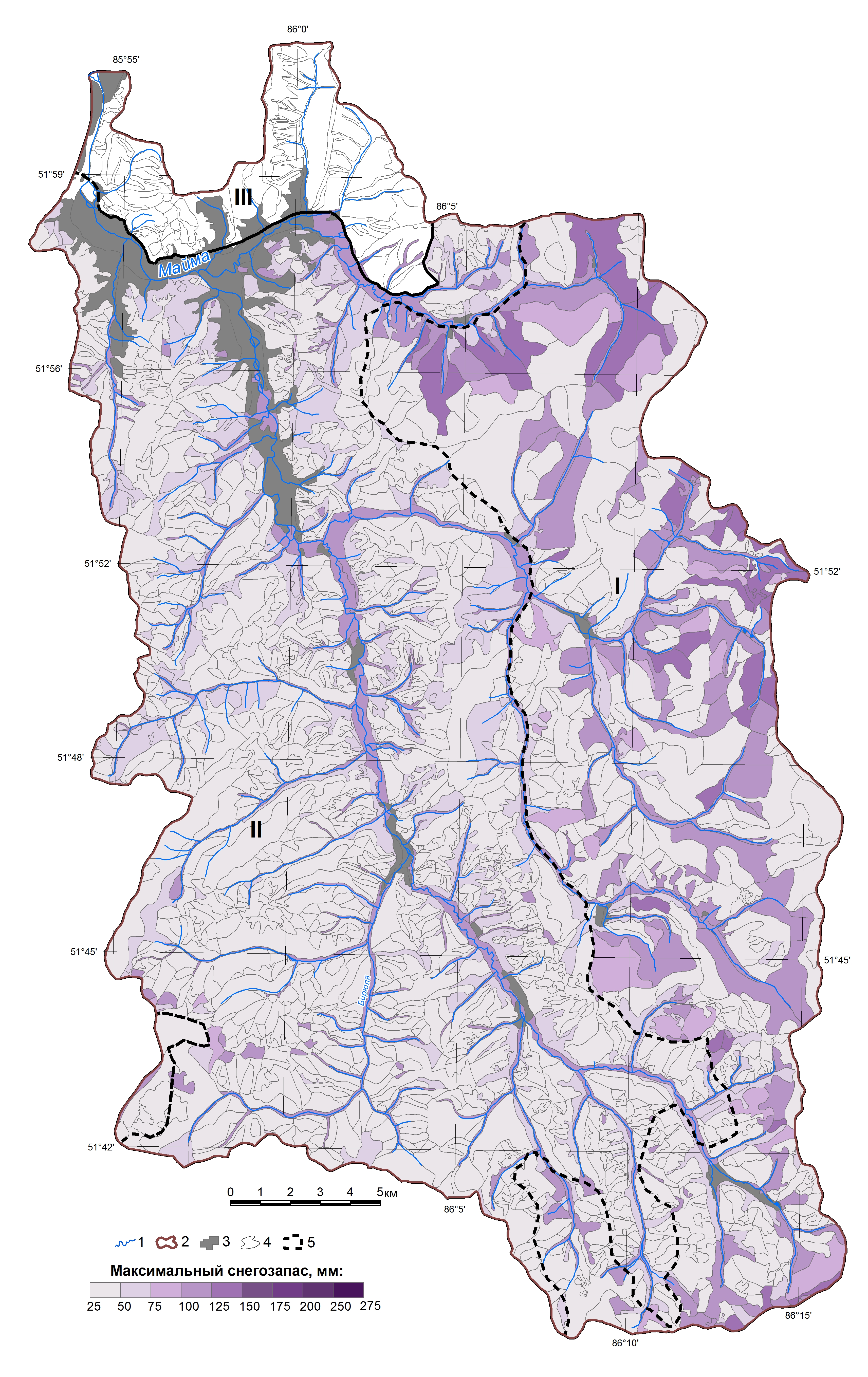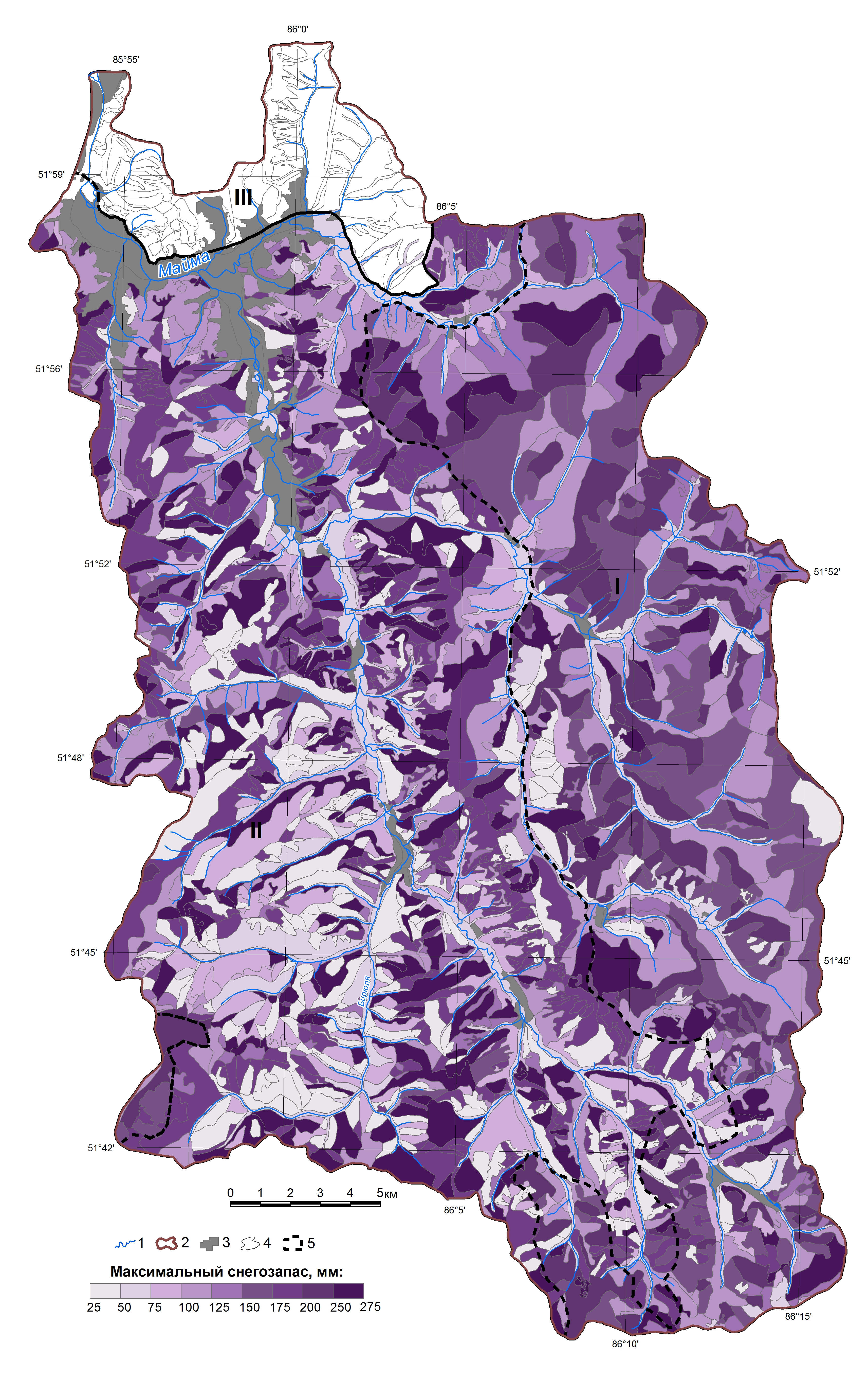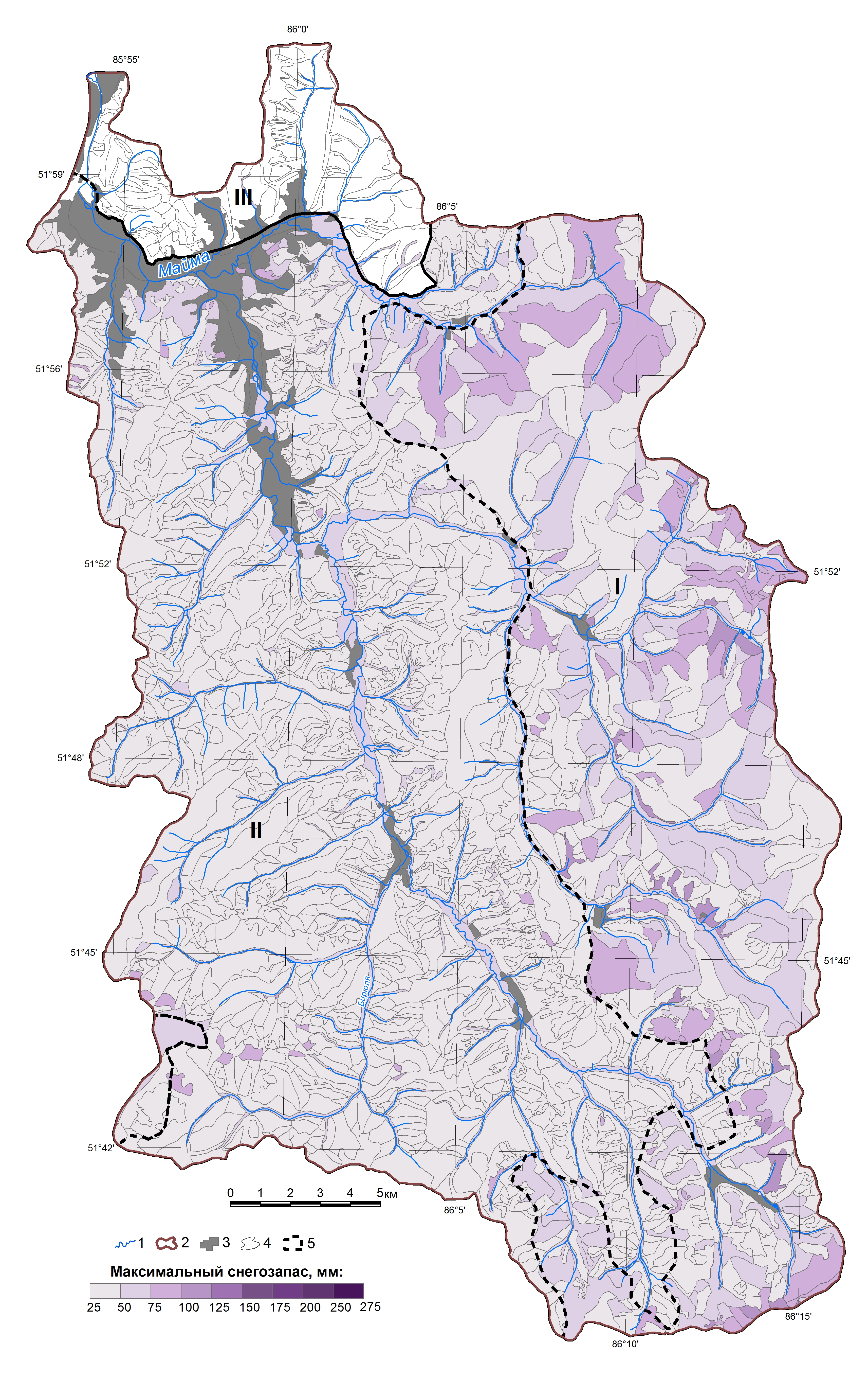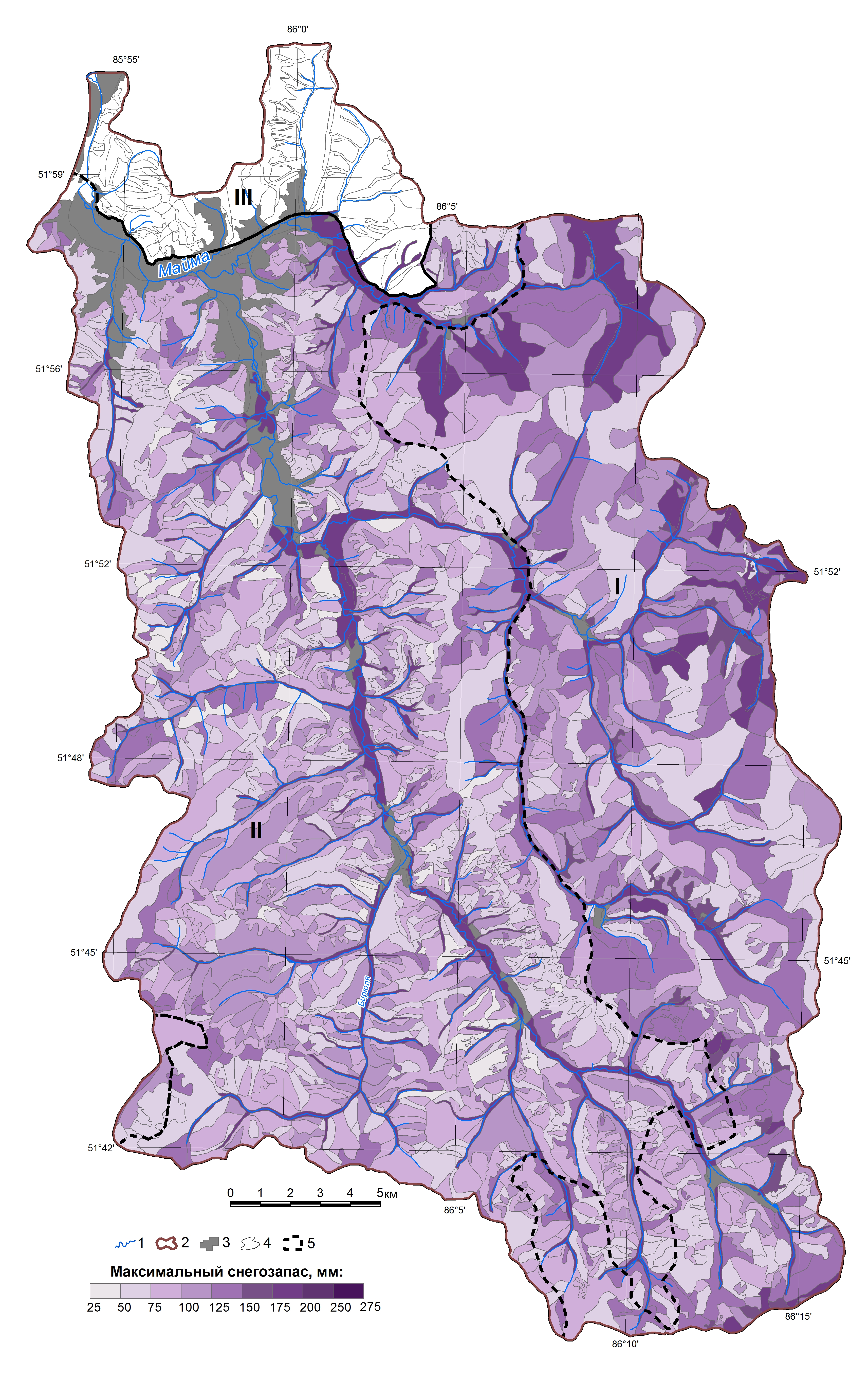1. Максимальные снегозапасы 2014/15 г. 1 – реки; 2 – граница бассейна; 3 – населенные пункты; 4 – группы урочищ; I–III – подтипы ландшафтов: I – чернево-таёжные субнеморальные; II – подтаёжные; III – лесостепные барьерно-циклонические; 5 – максимальный снего