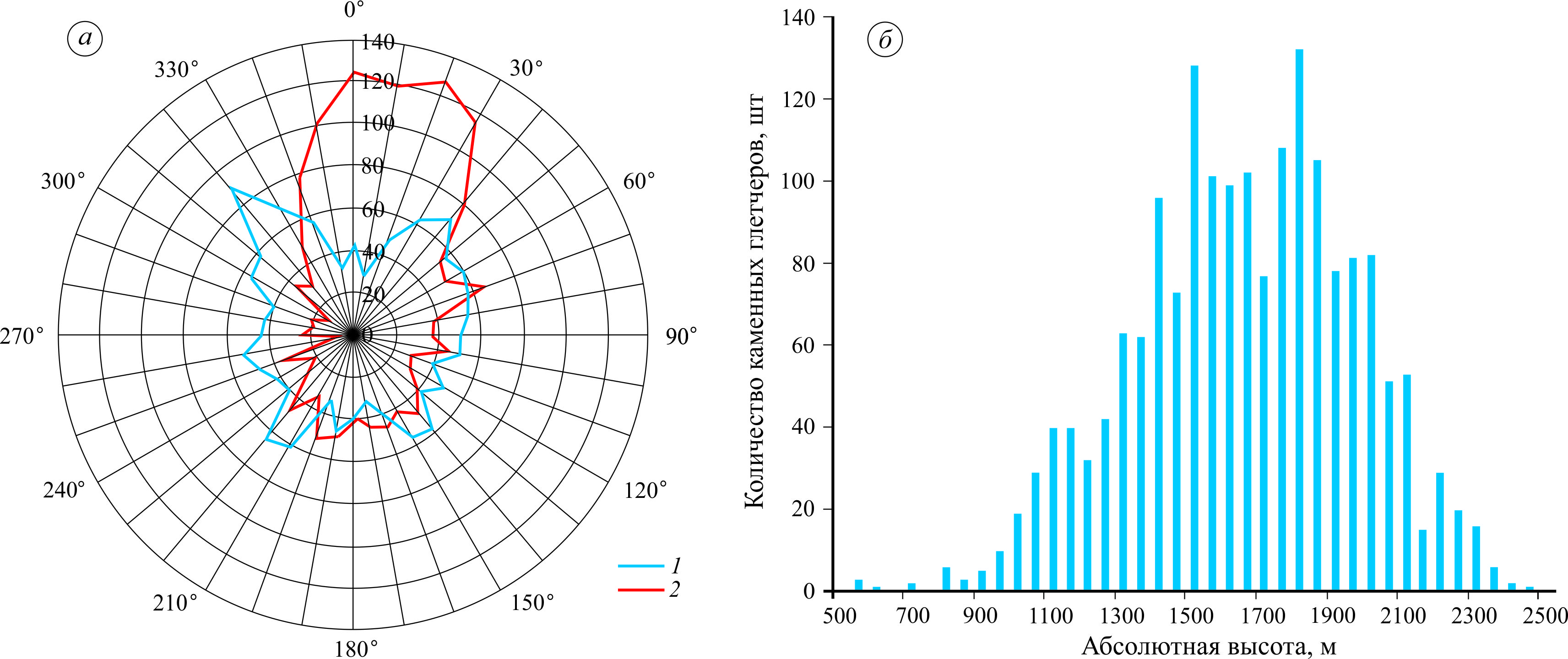 На хребте Улахан-Чистай, при помощи дистанционного картографирования, установлено 1812 каменных глетчеров, которые расположены в интервале высот 550–2450. Основная их часть относиться к присклоновым типам каменных глетчеров. Активные генерации этих образований расположены в осевой части хребта. Их средняя абсолютная высота составляет 1726 м. Полевые исследования для заверки результатов дистанционного картографирования были проведены в верхнем течении р. Курэтэр, который расположен в восточном склоне хребта.