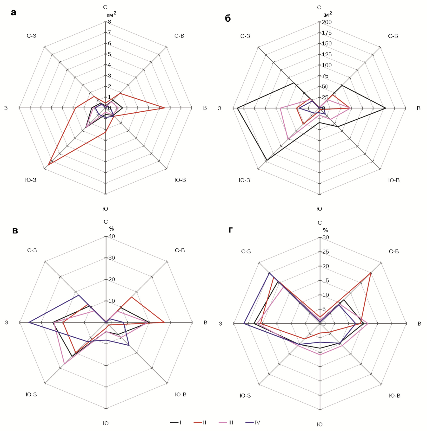 2. Рис. 2. Изменение ряда характеристик оледенения Камчатки в зависимости от экспозиции | |