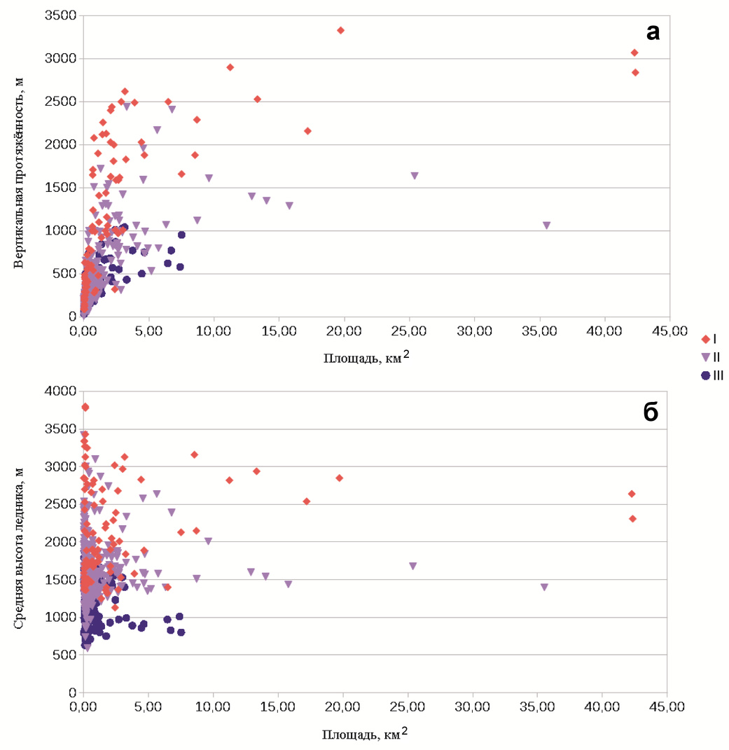3. Рис. 3. Занимаемый ледниками Камчатки высотный диапазон (а) и средние высоты ледников (б) | |